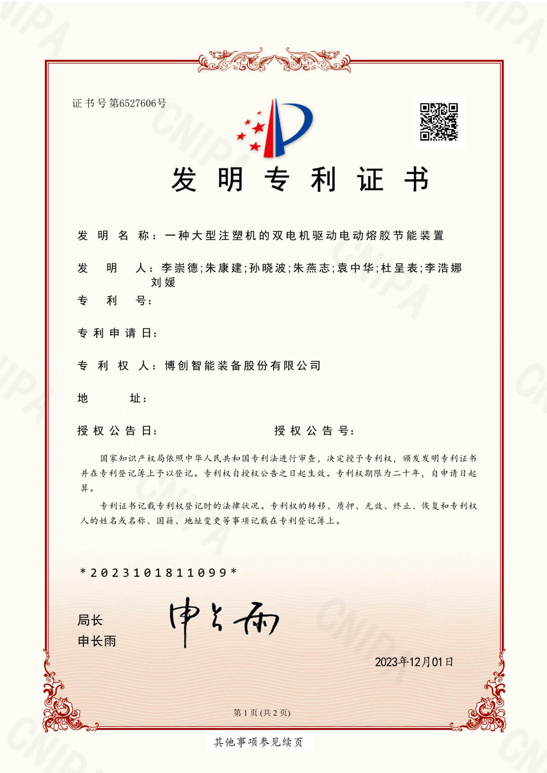 近期,博創(chuàng)榮獲國家發(fā)明專利《一種大型注塑機的雙電機驅(qū)動電動熔膠節(jié)能裝置》,專利號為:ZL 2023 1 0181109.9。
